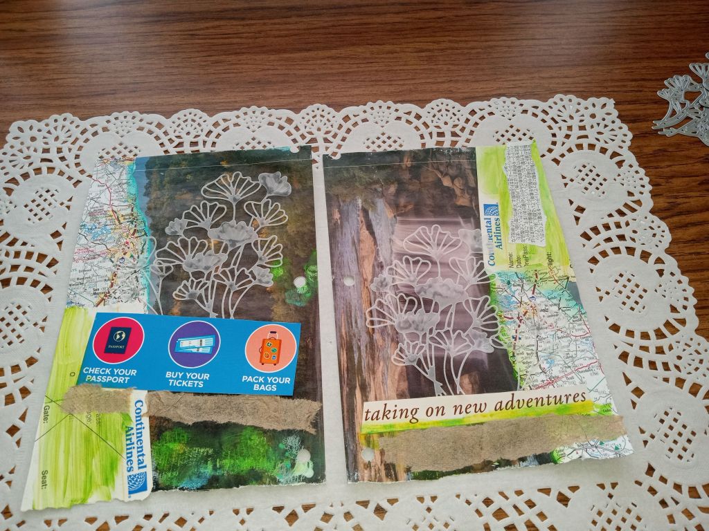 Two junk journal pages for #GetMessyMay prompts, #4 Adventure and #5 Courage. Both with gel crayon, which I’ve really enjoyed using. It’s easily water soluble and blendable!