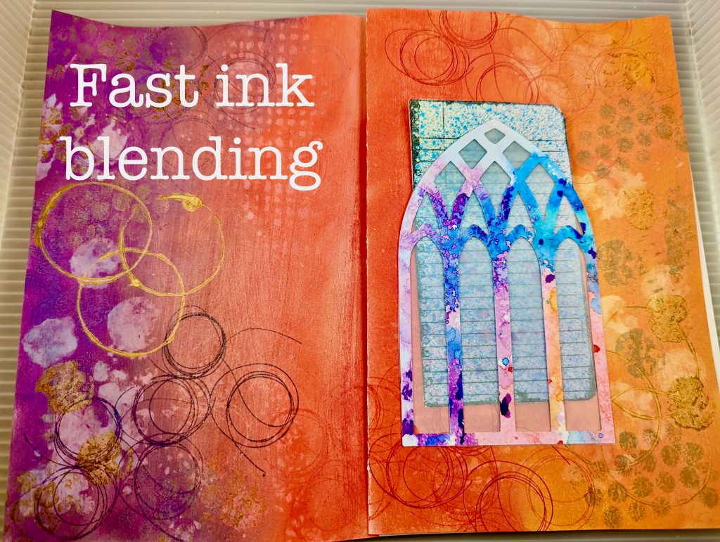 This is my spread for the Junk Journal July prompt “contrast.” I started with the fastest ink blending, using liquid drops of Distress Oxide reinker on mixed media paper with a light coat of gesso.