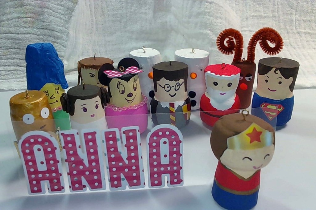 The corks are decorated with acrylic paint, Sharpie markers, paper, and whatever else I had lying around.