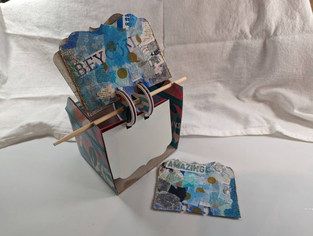 The holder is a tissue box cut in half, the two halves glued together, with a vertical channel to hold the chopstick. The tissue box is 4 1/2” wide, which is wider than most commercial Rolodex holders.
