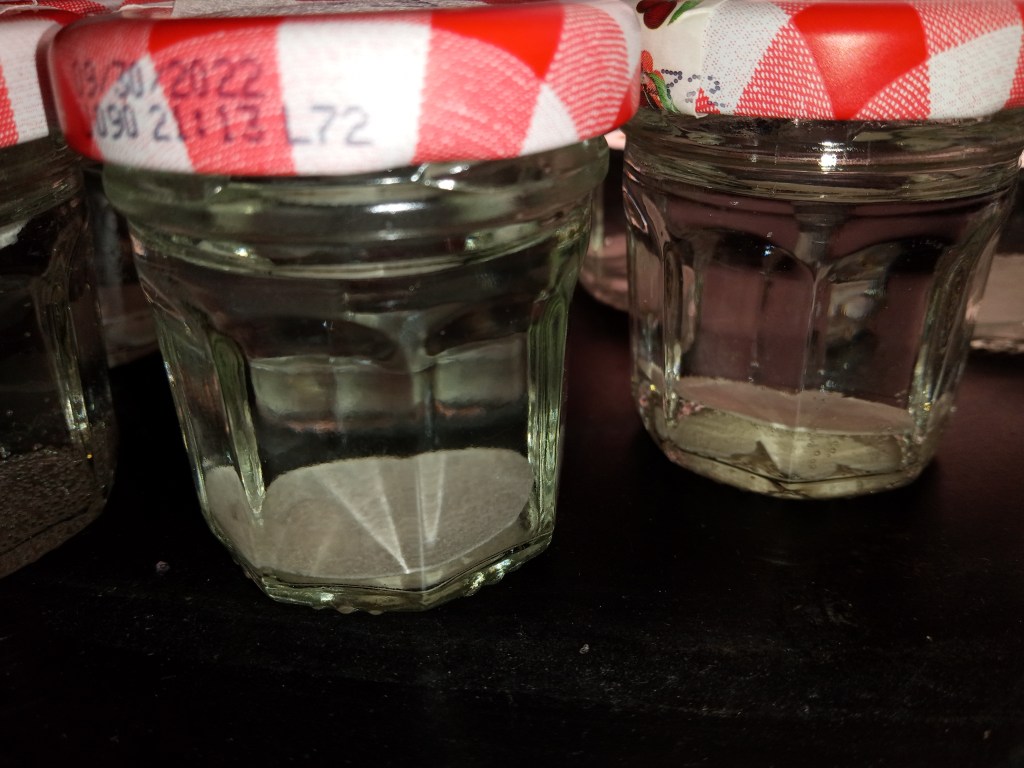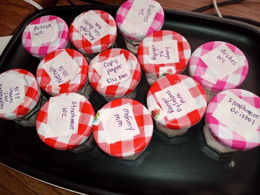 Out of curiosity, I took three punched pieces from every variety of watercolor and mixed media paper I had on hand and put those in tiny jars with water to see what would break down fastest and slowest. I threw in some copy paper, some Neenah 110 pound, some 100% cotton “resume paper”, and some bristol for comparison. The pieces were a 1” circle, a tiny scalloped circle, and a heart… except some paper was too tough for the heart punch, so those got a 1/4” circle. (These tiny jars are left from the Bonne Maman advent calendar and hold 30 g, about 1 ounce.)